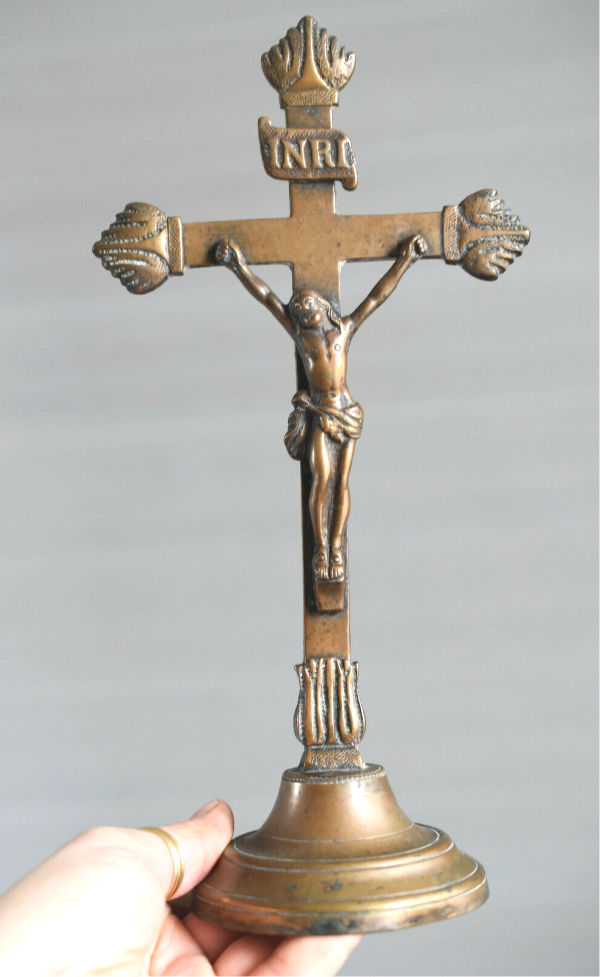 I bought this small 18th century bronze crucifix from a seller in France. This would have been used on a home altar. Why did I buy this? In part because of its age and lovely patination.