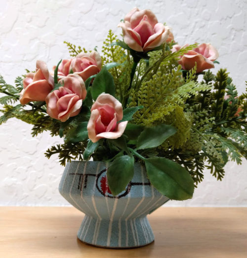 I was wandering around my neighborhood thrift store the other morning after my post office run and not feeling too hopeful. The few things I was mildly interested in were too pricey for me to resell. Sometimes it’s like that. I walked down the ceramics aisle for the third time, shaking my head a bit as I went but still looking. I grimaced a bit at this plastic flower nonsense on the top shelf, but, hold the phone…what’s that underneath that mess? Looked mid-century modern Italian to me!