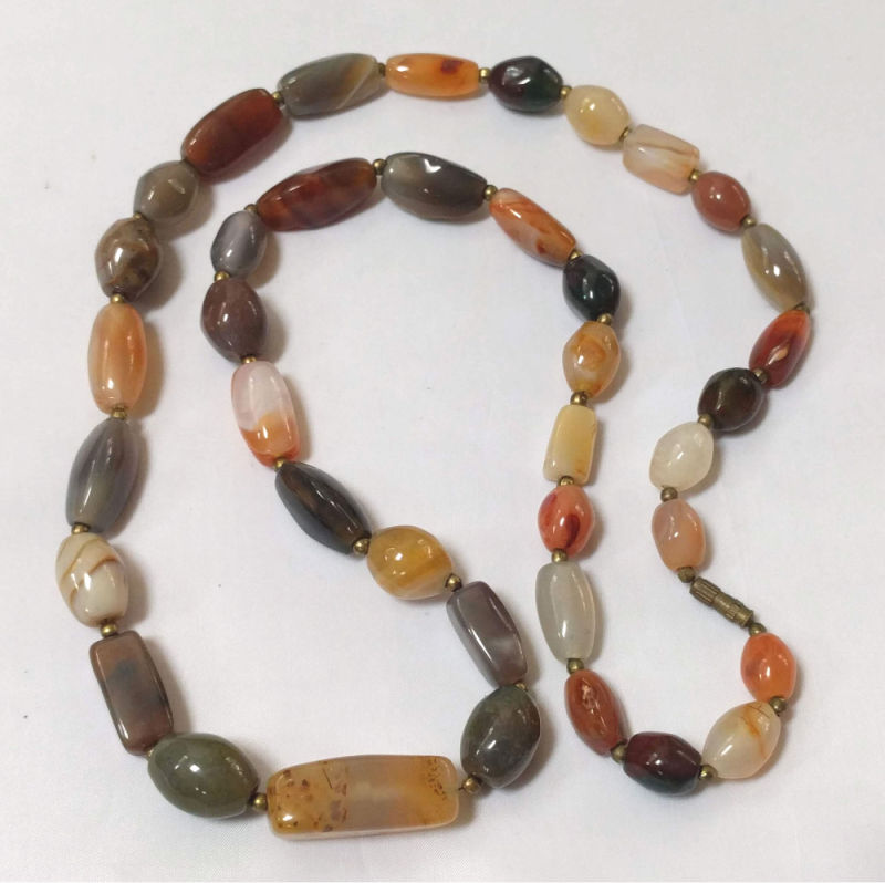 This longer polished agate bead necklace, likely circa 1950-1970, is not uncommon or particularly on trend, but there are folks who will appreciate the natural beauty of these stones in lovely fall hues.