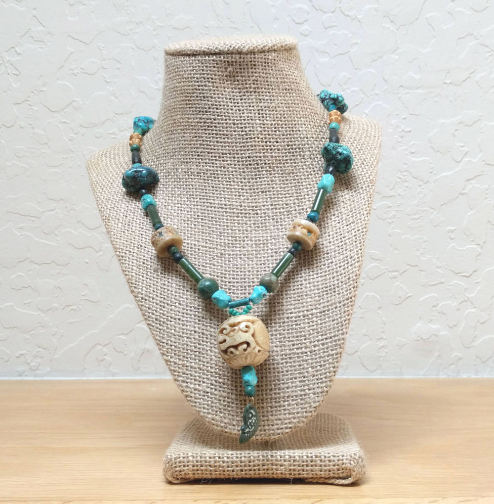 This handmade necklace features carved tagua nuts and what are likely turquoise nuggets (they are not dyed howlite).