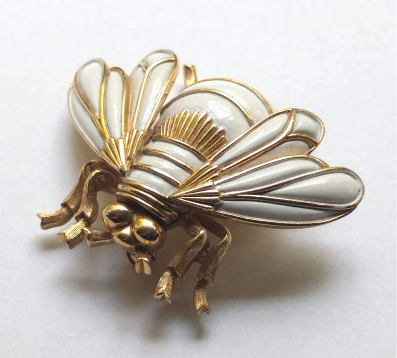 I knew this mid-century enamel Trifari bee pin was a winner. Can’t you picture it on the lapel of some smart 1950s navy jacket?