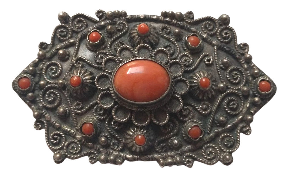And of course one of the other things that brings me joy (and transports me out of this quagmire) is hunting for vintage stuff. Though I much prefer in-person sourcing, online will do in a pinch. I bought this large, heavy antique pin from an eBay seller. It’s .800 silver with coral cabochons and a C clasp. This is just fabulous. It likely hails from the Middle East and has a great Boho vibe.