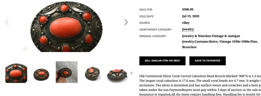 I paid up for both these pieces and I need to do more research to figure out fair asking prices. Part of my research includes checking recent sales using WorthPoint and I found a similar (but smaller) pin recently sold for $300 (!) though most sell for under $100.