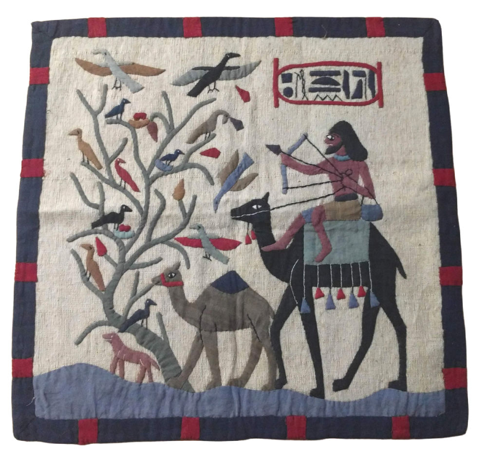 Here’s another fun older piece–a hand-made appliquéd and embroidered Egyptian scene–possibly made during the Egyptian Revival of 1880-1920. According to this eBay seller it was part of a collection from a textile museum in Lowell, MA. I believe he was referring to the American Textile History Museum which closed its doors in 2016 and sold off its assets. The stiff beige fabric used for the background does have foxing, but otherwise it’s in quite good condition. I’m attracted to folk art pieces like this and I think others appreciate them too. This truly is a one-of-a-kind piece.