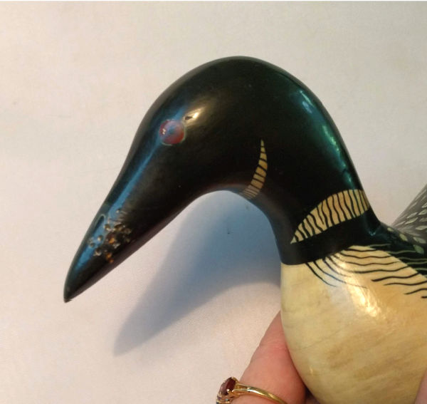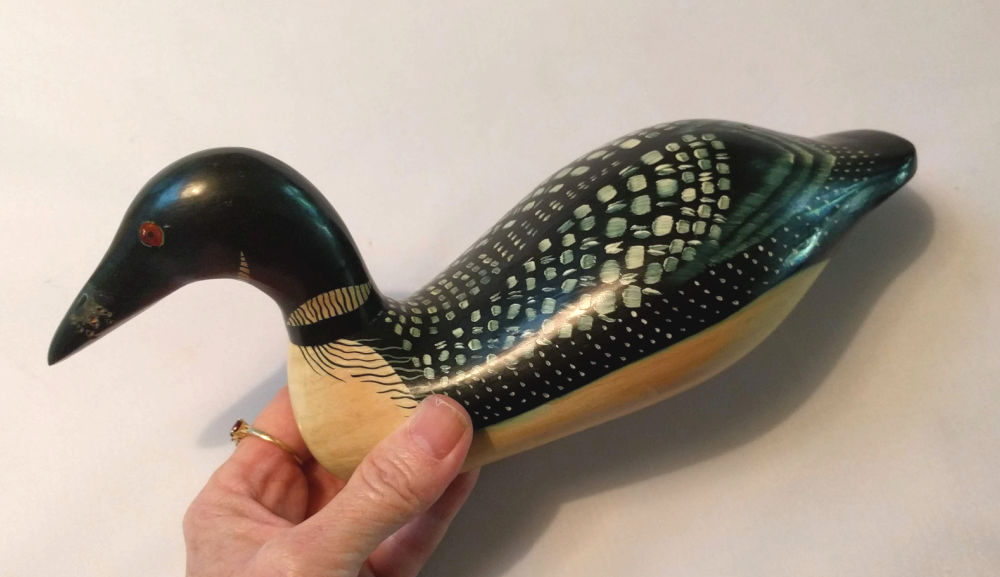 Here’s one…a carved, hand painted wood loon decoy initialed “KD” on the bottom, but the bill appears to have been nibbled on by a kitten! (I know this because I had a plastic comb that had these same tiny bite marks from a kitten.) But still it was a neat piece.