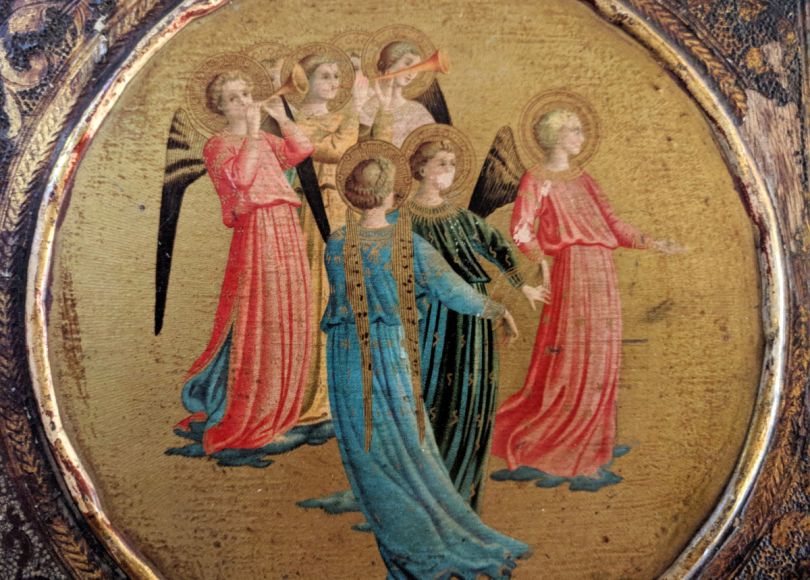 This image of angels below is from a 15th century painting “Coronation of the Virgin.” Some of the plaster work (over the wood) and the gilding is chipped but I find that oddly more appealing.