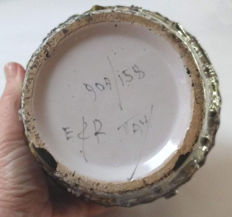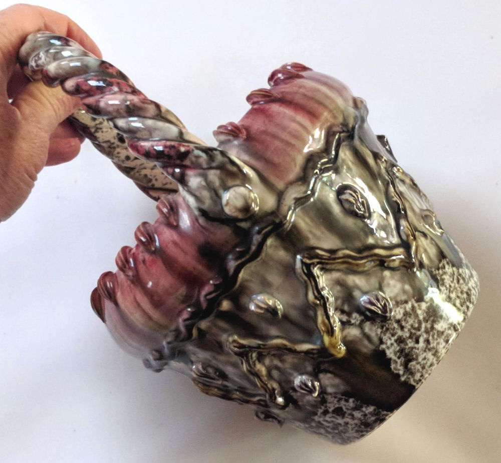 A neighborhood thrift store find, I haven’t decided if this is striking or “so ugly it’s good.” There is a lot going on with the twisted handle and applied elements and wild glaze. Still it’s so different that I think someone is going to love it.
