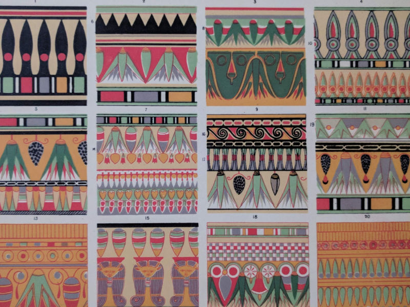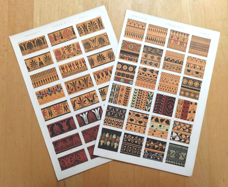 Years ago I bought several lots of antique (mid-1800s) pages from “The Grammar of Ornament” book by Owen Jones.