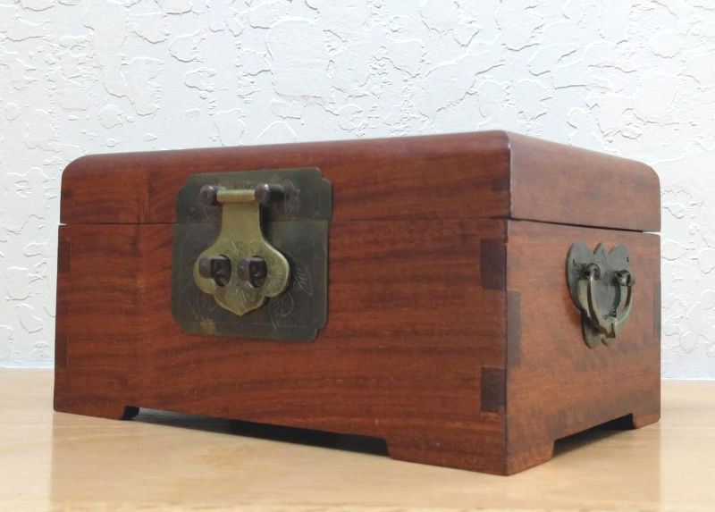 Here’s one thing I did buy this month at my neighborhood thrift store–a handsome mid-century George Zee, Hong Kong, wood and brass jewelry box. Other than missing its locking pin for the front clasp, it’s in wonderful condition.