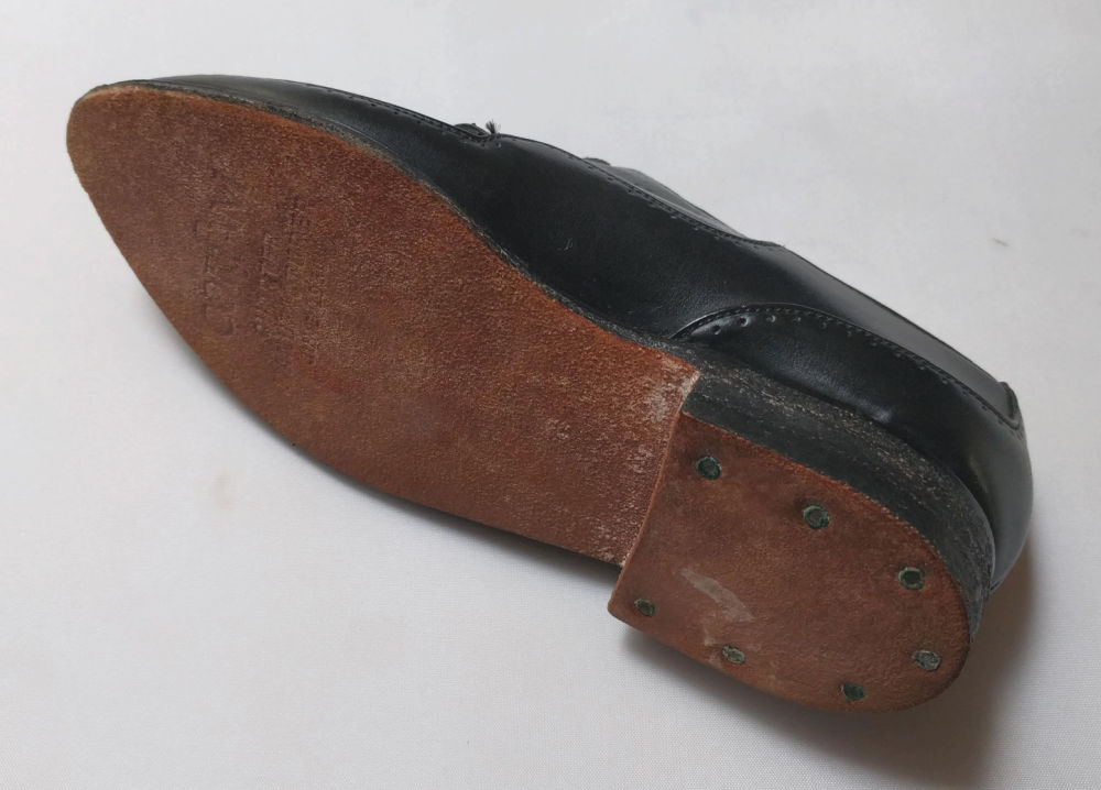 Isn’t this fabulous?? I found it on a shelf with a bunch of Christmas decorations. So far I have not found one online like it–anywhere! The bottom is embossed: “Corfam, Charter Manufacturer, June 1964.” Turns out Corfam was a faux-leather product invented by DuPont in the late1950s and shoes made with it in the 1960s had real leather bottoms and a Corfam top.