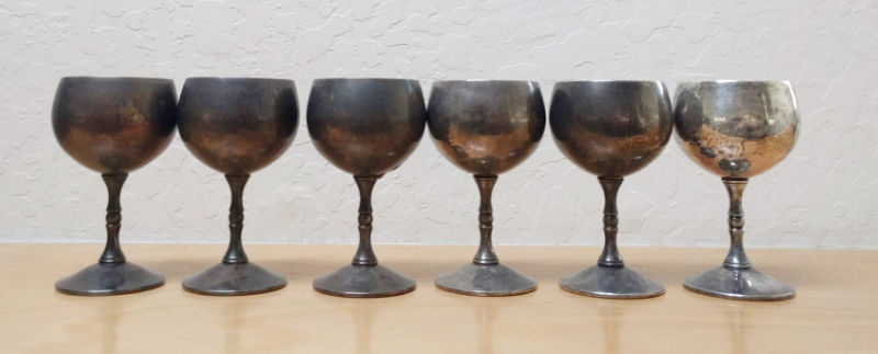 On Sunday I popped in my neighborhood thrift store for 30 minutes. It was tough picking. Mostly newer, cheaper and damaged items. The best thing I found was this set of six vintage F.B. Rogers silver plate wine goblets made in Spain. I debated about buying these as they are heavily tarnished and I knew I would want to polish these at least a little before photographing them. (Another seller listed hers with nearly black tarnish and wrote about their “beautiful patina.” But make no mistake, patina and tarnish are two different things and no one is going to want to drink wine from a heavily tarnished silver goblet.)