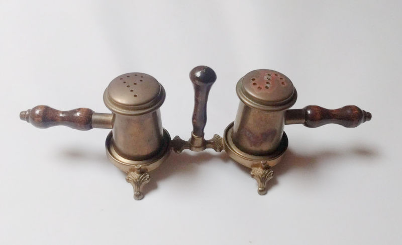 I was charmed by these little brass salt and pepper shakers with wood handles and their little stand. I believe these are European, possibly French (sel and poivre), and date to the 1960s/1970s.