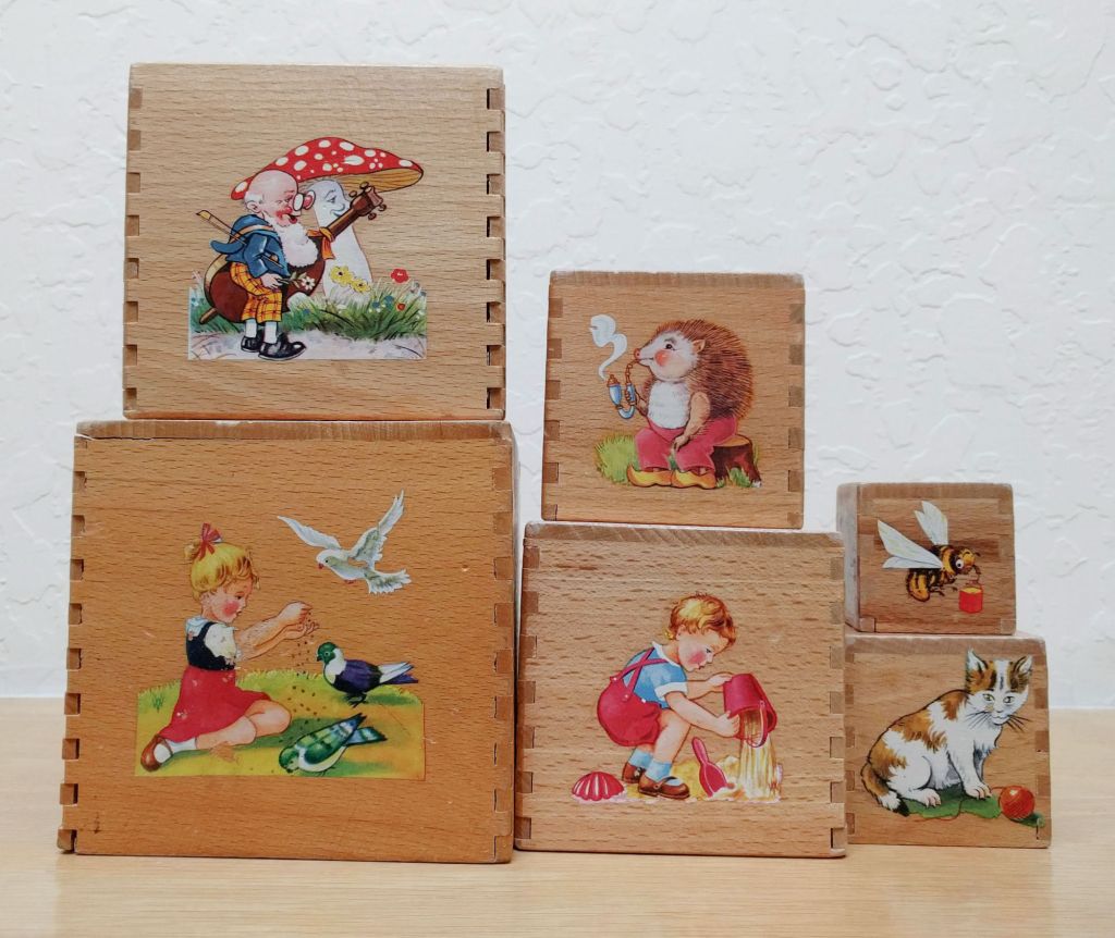 Just to be honest I have found a few things at neighborhood thrift store over the last week or so (couldn’t totally stop going!), like these absolutely fabulous vintage European nesting wood blocks with cute images. I would have loved these for my daughters when they were little. They have sweet images on each side.