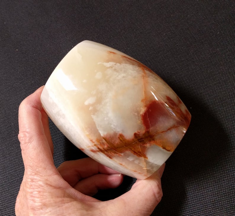 And I found this handsome, heavy onyx candleholder. One end holds a tea light candle and the other a taper! I adore things made of natural stone and this one has interesting colors and striations.