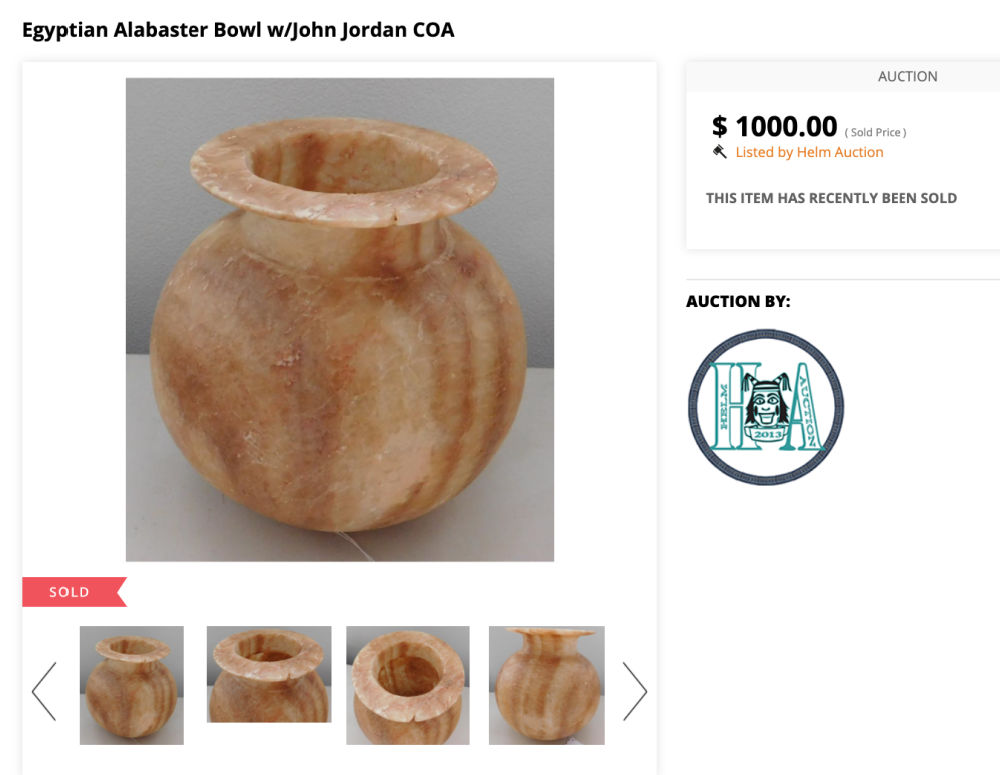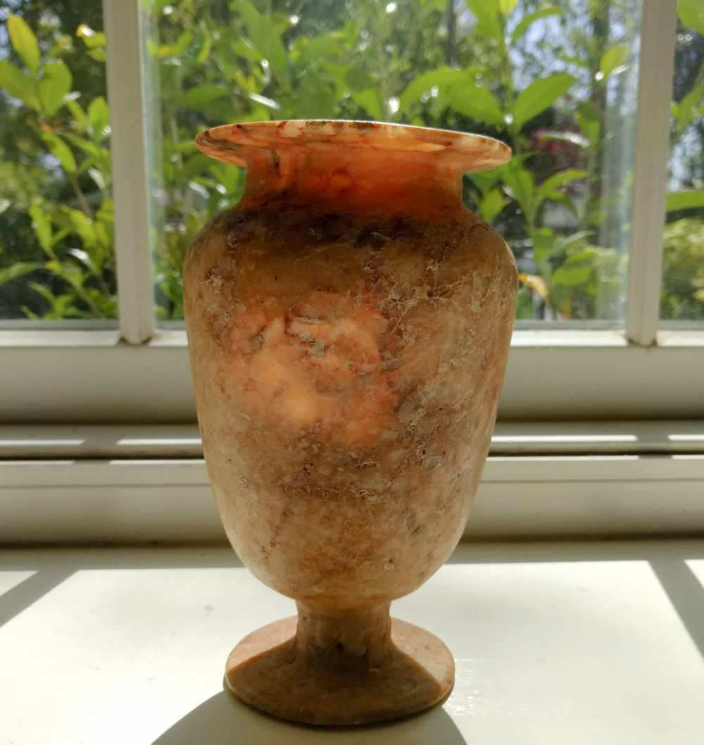 I’ve been doing a bit of research and have found museum reproduction alabaster pieces by Kemet Art of Egypt that have a similar look (they sell in the $100-$300 range). But I have also found ancient pieces that sell for much more. This bowl from the Egyptian New Kingdom period (1550 β c. 1352 BC) sold for $1000 and was projected to go much higher.