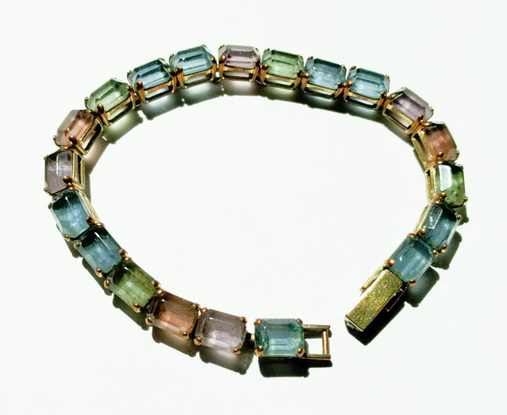 This vintage Monet tennis bracelet with stones in a delightful muted spring palette was a neighborhood thrift store find. I could see inclusions in the gems, so these are not glass or rhinestone but low-grade semi-precious stones. It’s not a high-end piece, but a pretty every day bracelet.