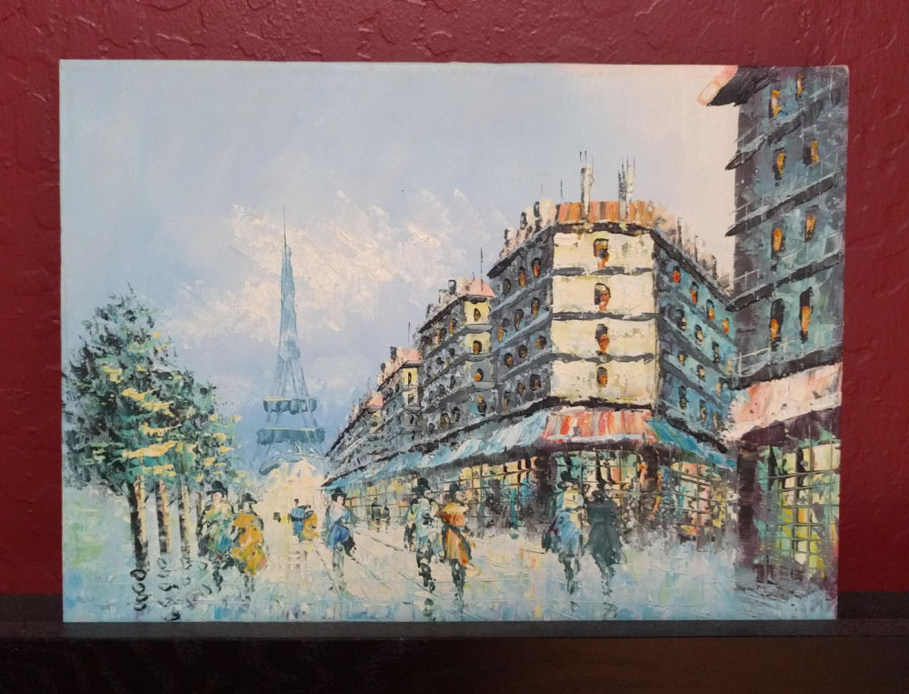And this Impressionist-style Paris painting was a winner. It was in a 1970s frame that was falling apart so I removed it. I think the painting displays nicely on its own. This cityscape gives the the impression that there’s just been a spring rain! It is unsigned, but in the style of the popular Caroline Burnett Paris paintings.