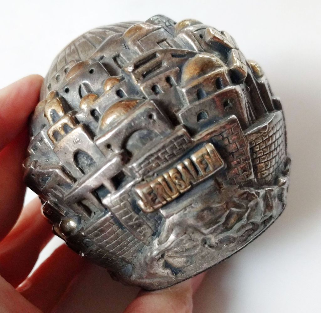 Everybody was walking past this metal Jerusalem paperweight without giving it a second glance. Here’s the thing…it has a sterling silver overlay! I sold one a few years ago for $75. (There are more on the market now, so I’ve priced this a little lower.) A great gift idea for anyone who loves the Holy Land.