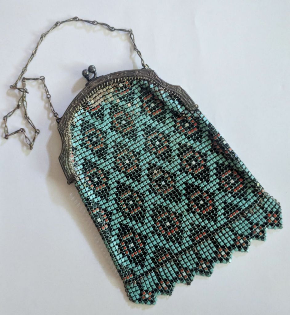Well, her “Beaded evening purse” was an antique Whiting and Davis enamel mesh purse! I gasped when I pulled it out of the bag. It’s in beautiful condition other than a bit of color loss to a few of the mesh pieces. (You can see it near the top.) Thankfully it wasn’t a family heirloom and she confessed she didn’t remember where she got it.