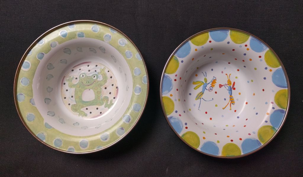 Recent Find: The other day I spotted these MacKenzie-Childs metal enamelware pieces. MacKenzie-Childs makes whimsical and zany items that sell from $$ to $$$$…and folks like them! These two children’s bowls are the first I’ve found “in the wild.” Not particularly valuable, but I thought worth buying.