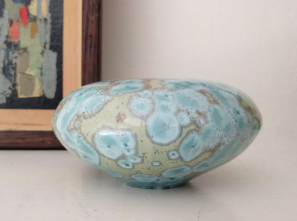 Recent Find: I was happy when I saw this small crystalline-glazed pot on the shelves. It’s more stunning in person seeing the flash in the crystal parts. It’s signed, but I haven’t found a match in my research yet.