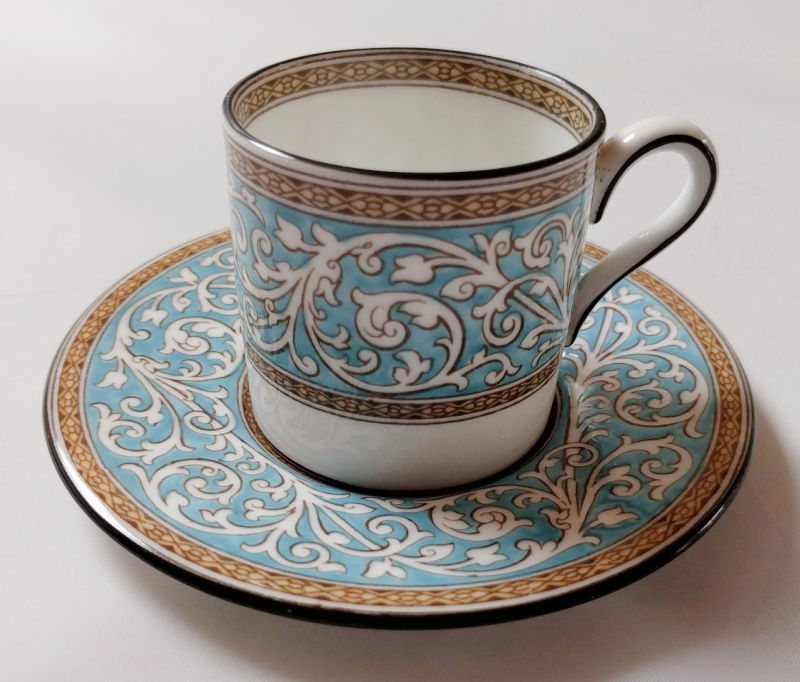 At my neighborhood thrift store I found a number of pretty Wedgwood china teacups and dessert plates. I tried to locate the name of the pattern while in the store, but was unsuccessful. I dithered about whether to buy it all but in the end settled for two tiny espresso/demitasse cups for $9.18. Turns out the pattern is a discontinued one called “Praze Turquoise.” I find it quite pleasing. Replacements.com are selling them at $23.99 per cup and saucer and since I found no others for sale, I’m listing mine at the same price.