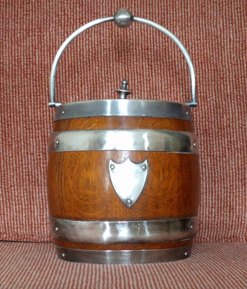 I did find one pricey thing that I believe may have more meat on the bone–a 1920s-1950s oak and metal ice bucket or biscuit barrel. We’ll see how it turns out.
