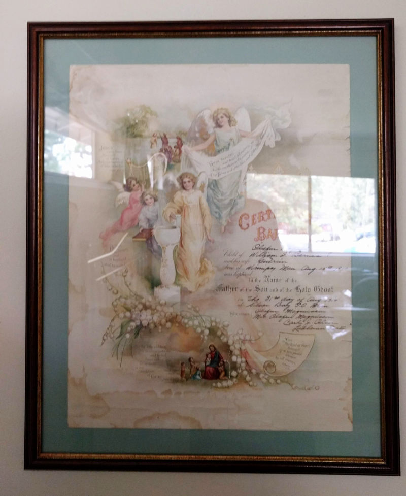 So in the end I’m glad I went and am happy with all I bought. But I’m kicking myself for passing up some things. Here’s one that breaks my heart–a large (water-stained) certificate of baptism with a bevy of angels. It was dated 1914 for dear Oliver of the Mystic Shrine. I so wish I had taken it as I fear it is now in the dumpster as that is where all the remaining items were headed a few hours after I left.