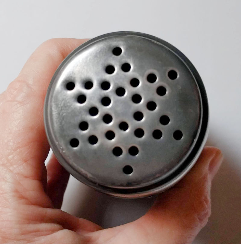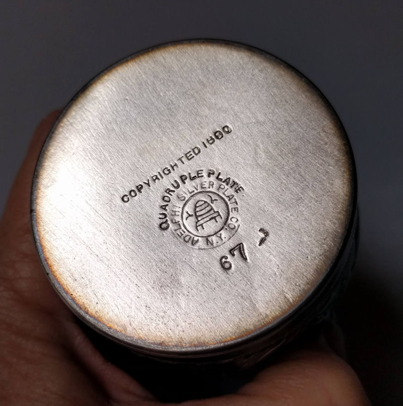This antique silver plate Adelphi shaker is such nice quality. Copyrighted in 1890 it has just the right amount of patina and still plenty of use left in it. I’m guessing, given the larger holes on the top, that it’s a sugar shaker and a darn pretty one with this repoussé floral design. So far I’m not finding another one like it online so possibly it’s a scarce item at this point.