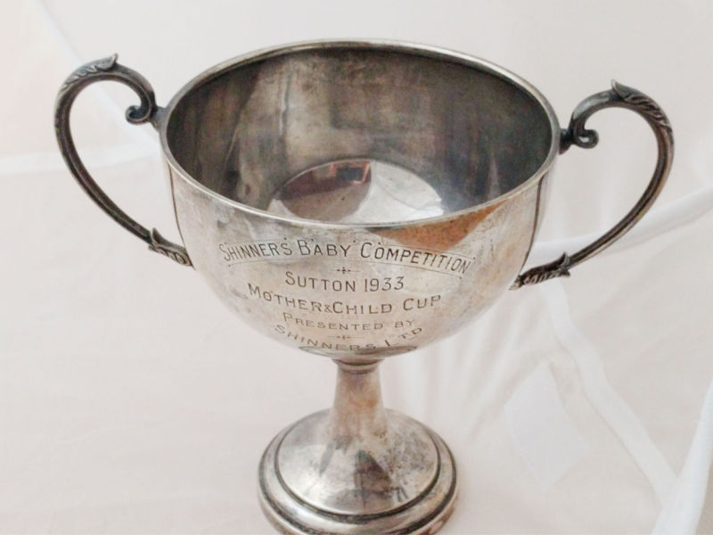 This vintage sterling silver trophy was part of my engraved sterling collection. This nice-sized cup with a good weight (351 grams) is from a Shinners’ Department store (Sutton, England) baby competition! While it’s engraved for 1933, the cup was actually made in 1929.