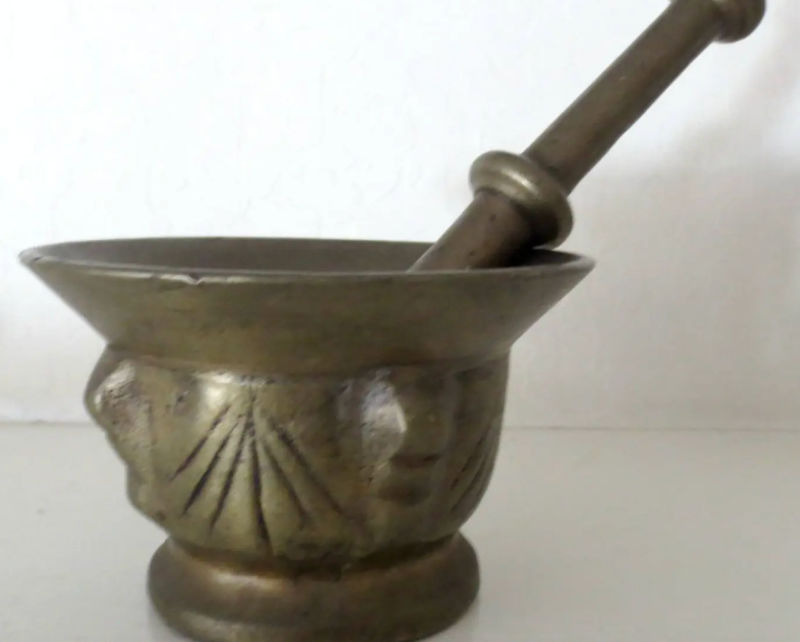 When items take a long time to sell, I do revisit them and sometimes adjust the price or am willing to entertain offers. Such was the case for this primitive brass mortar and pestle. I had bought it for under $10 and spent hours researching it. (I do believe it was antique, possibly hundreds of years old, and likely Spanish because on the design.) Initially I listed it for $120, but gradually lowered the price as the years went by. Still there was little interest in it.