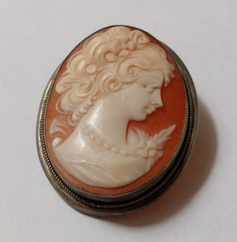 I love real shell hand-carved cameos, but just don’t seem to wear outfits that lend themselves to a cameo. Time to let this pretty girl go. She’s set in .800 silver with both a pin and pendant option and likely made in the 1940s/50s.