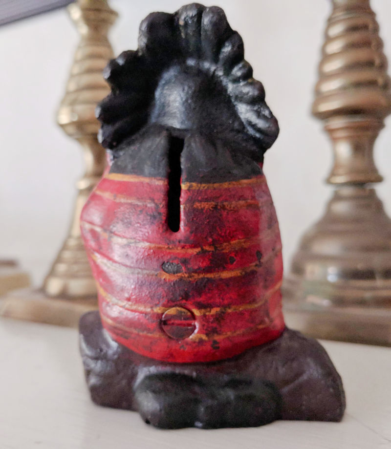 Still it does have a little wear and doesn’t have a more modern Phillips head screw that often appears in post-1945 pieces. But I will need to do a lot more research to figure this bank out and what I can fairly charge. Here are a couple of articles that I’ll be checking out: Cast Iron Toys & Banks — Tips to Identify Reproductions & Fakes and Real or Repro: Cast Iron Toys.