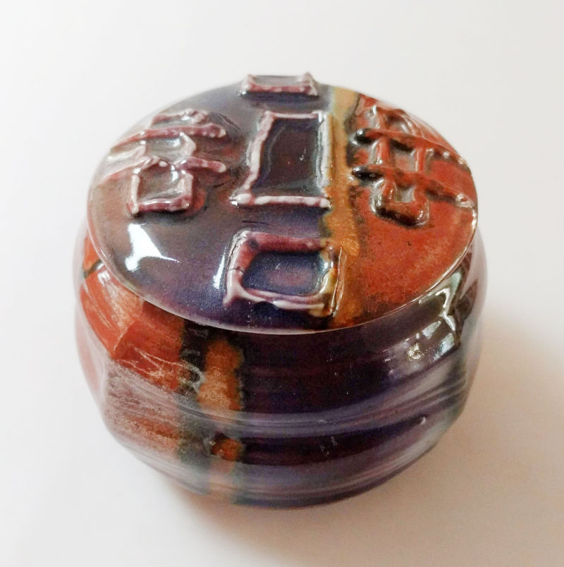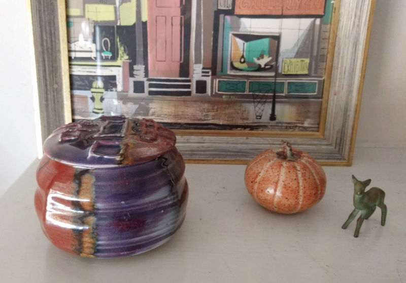 This funky pottery jar, with a great mix of fall colors (rust, gold and purple), is by artisan Lisa Koch. It’s likely a vintage 1980s piece.