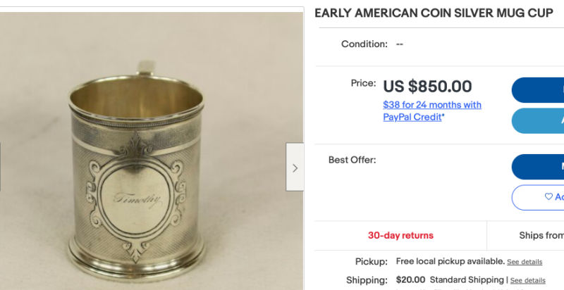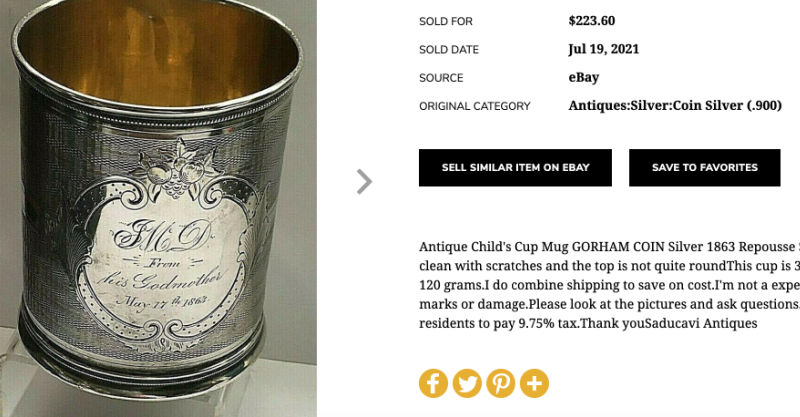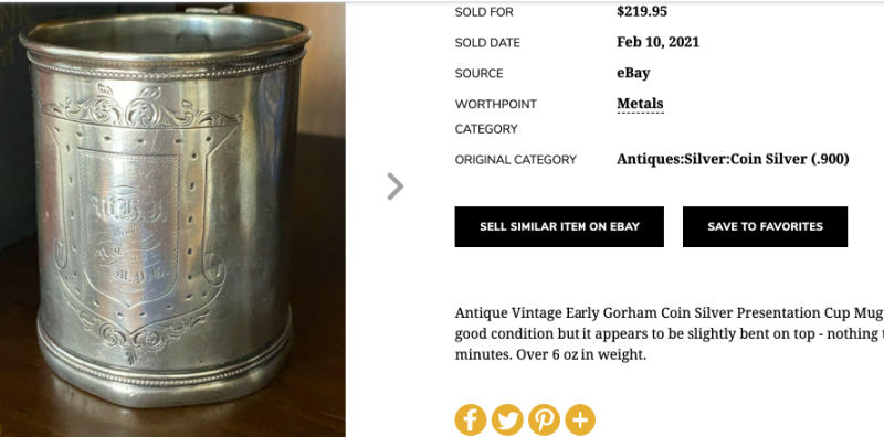 Since that experience I hadn’t bought anything else for myself on Chairish. And then I saw Fannie’s cup—a pre-civil-war era coin silver cup made by Gorham. It was a little beat up, but nothing egregious for being 160+ years old!