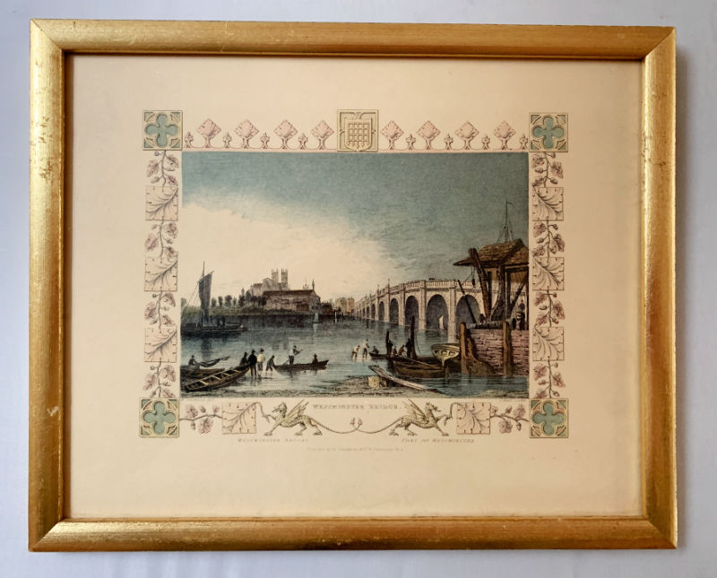According to one site (Ash Rare Books), these prints were steel engraved and later hand colored. Each has a fanciful border around the image. Ash has a number of the same prints listed for sale, though unframed, and it gave me a good idea of how I wanted to price them. (Sold prices on Worthpoint vary wildly.) Ash has this Westminster Bridge (above) priced the highest. They have it listed at 75 UK pounds (approx. $102 US dollars). I’ve listed mine for $68. We’ll see how it does.