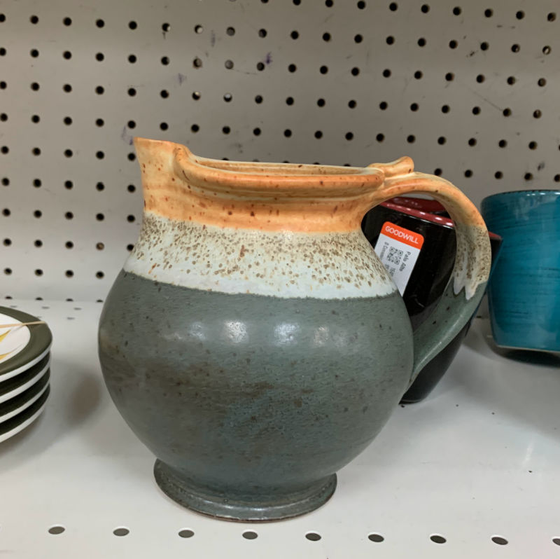 On the thrifting and antiquing front, it’s also been a bust. The few times I have gone out sourcing I’ve come home empty handed. I almost bought this artistan-made pottery pitcher for $7.79, but in the end put it back. It was nice and in my favorite slate-green color, but I thought it would linger a long time in my store.