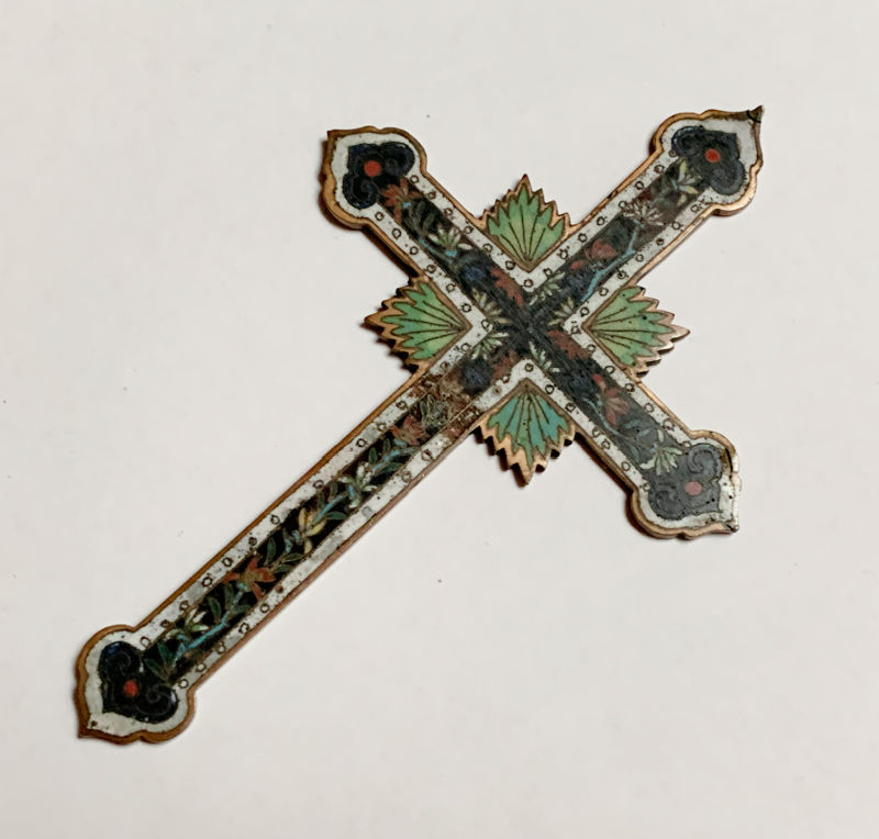 I’m fond of both old crosses and old cloisonne and this one has both! The cloisonne on this is so finely done with just a small bit of pitting and loss. I haven’t determined if this is from China or France as both countries produced similar crosses during this period. It has a teeny tiny loop at the top for hanging or wearing. It is just fabulous.