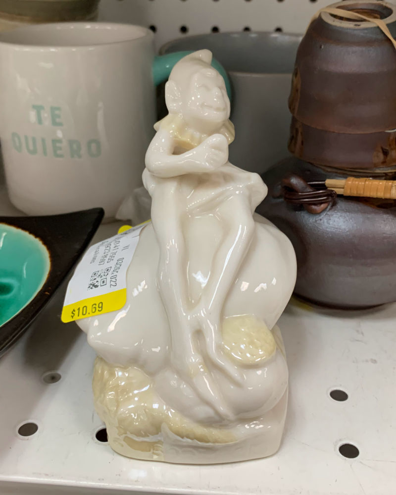 It’s just as well I am still finding things at home. Thrifting has been a bust. Went today to my neighborhood thrift store and didn’t buy a blessed thing. I spotted this Belleek porcelain leprechaun priced at $10.69, but since there are quite a few listed online and some starting as low as $27, this had to be a no. Plus Belleek rarely sells for me!