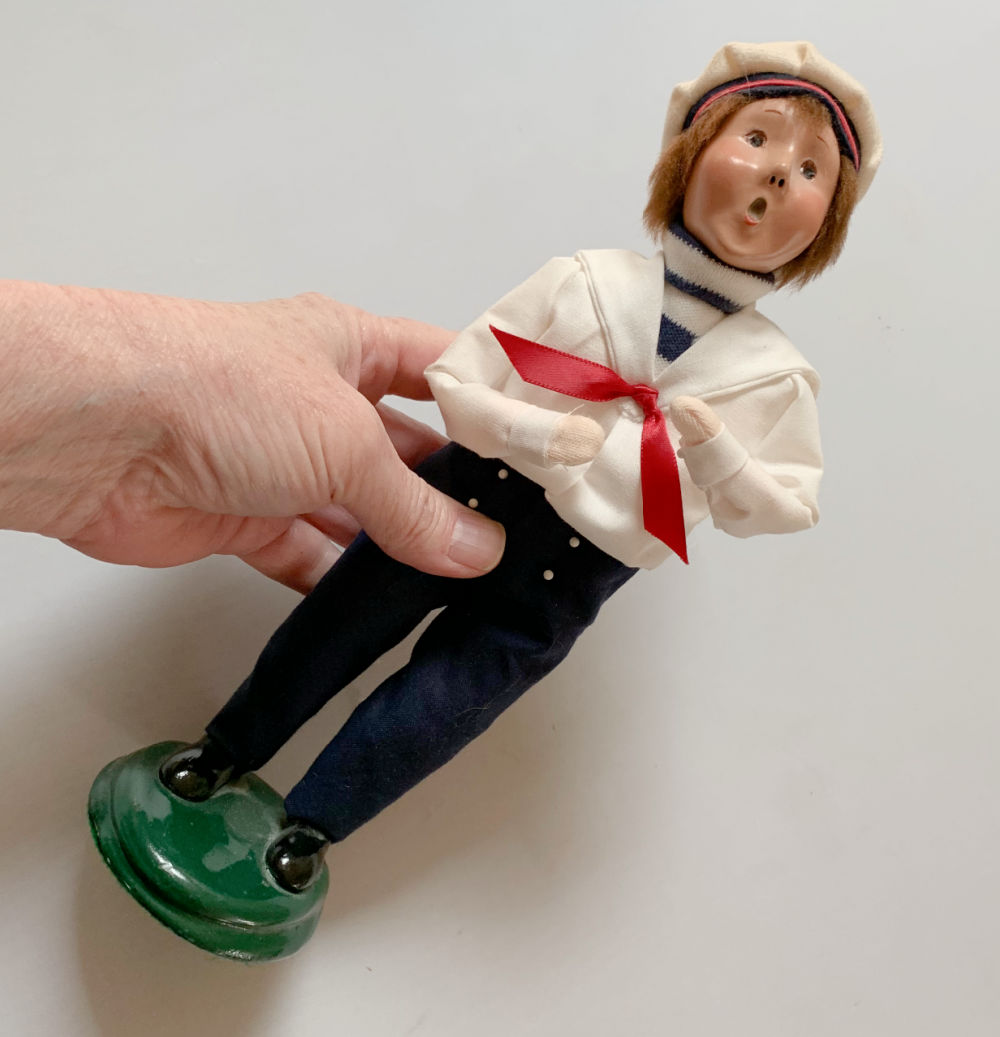 I told myself after I bought and sold my first and only Byers’ Choice Caroler (made $35 profit) that I would never again deal with them because I’m not into collectibles. Just no my thing. Then I found this sailor and though he seemed to be missing his prop (a piece of rope as it happens), I couldn’t leave him behind. Part of me was like, no, no, no, but I never set him down!! As it turns out he is not one of the more valuable ones…alas…but still a good bread-and-butter item.