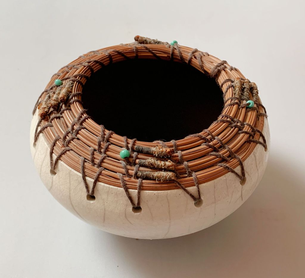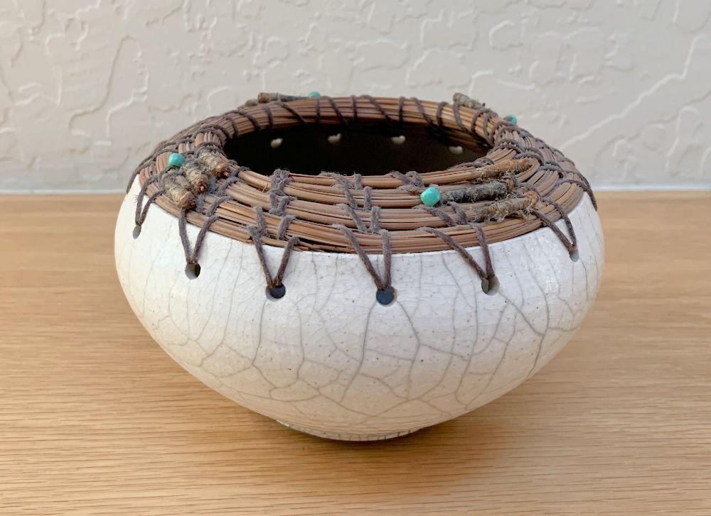 First was this fabulous artisan-made raku pot with pine-needle trim with a neat tribal, Southwestern vibe.