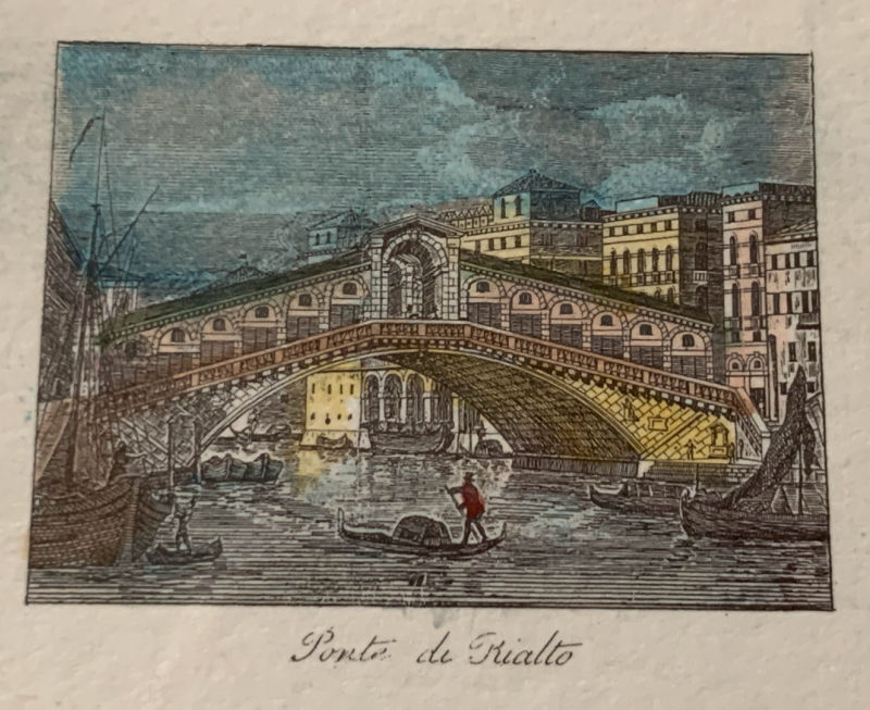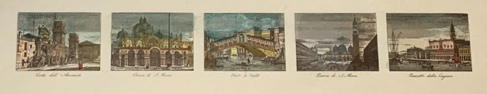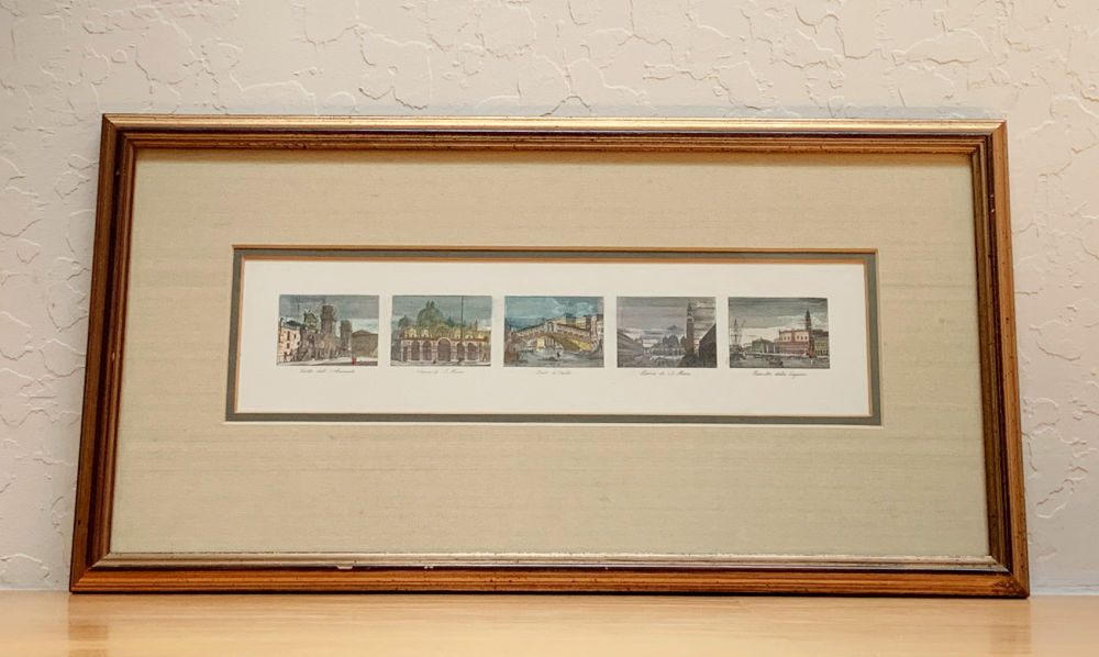 I also bought an intriguing bit of art–a small, professionally framed lithograph of Italian landmarks. Double matted, the inner mat is olive green while the tan mat has a linen-type covering which is definitely more expensive. While the frame and matting are not super old…likely in that last 30 years or so, the print is much older.