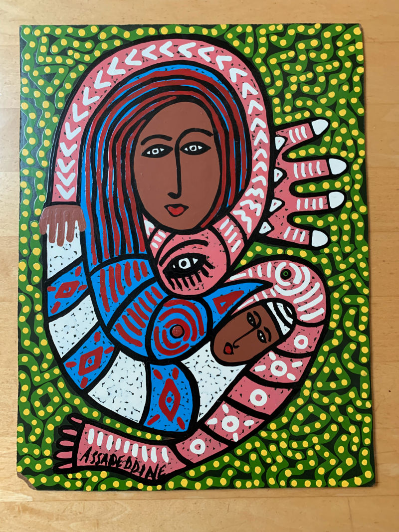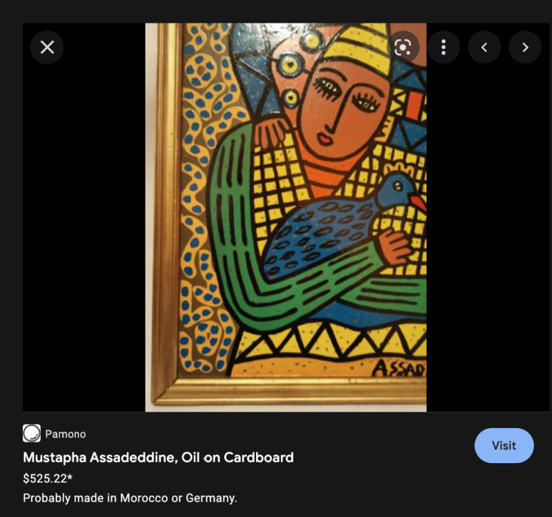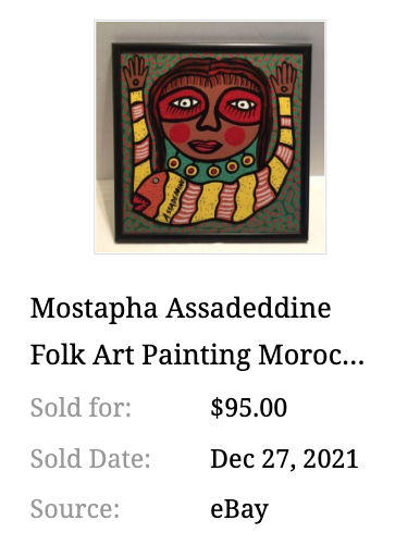 Turns out is was painted by Mostapha Assadeddine–a Moroccan street vendor with a unique folk art style. I’ve only found one sold comp on Worthpoint.