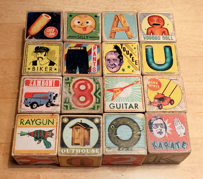 Turns out they are Fred and Friends “alternative” wood blocks by artist Christian Northeast and the company now longer makes them though they do make a popular1000-piece jigsaw puzzle of the blocks.