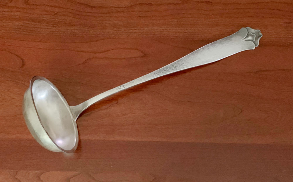 Our very first stop (they advertised antiques and flea market items) wasn’t even set up. No tables. No boxes. No people. Nothing. I guess they changed their minds???! So when we found our second sale we were delighted to find her set up and ready for business! I bought this HUGE silverplate ladle from her. It’s a handsome, well-made, Arts & Crafts-era piece. (Paid $3) I don’t suppose ladles are particularly popular these days, but I do find them ever so useful.