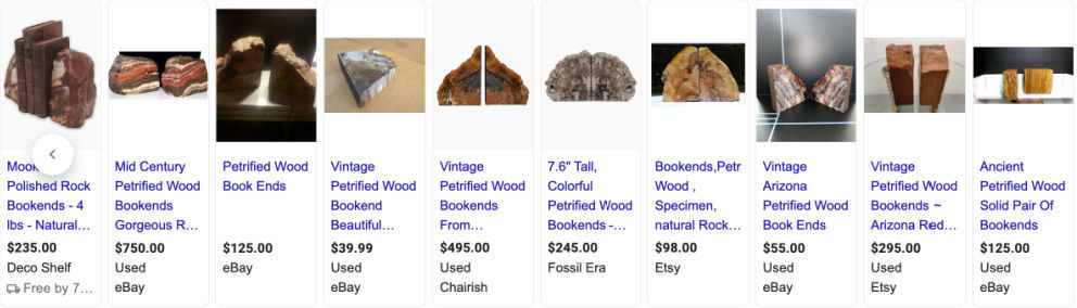 Like anything, these bookends are worth what someone is willing to pay for them, but many are listed for $95 and up. You’ll see a variety of prices in the screenshot below and in some cases it’s hard to tell why. Yes, some are bigger than others, some prettier, but does that really warrant a $750 price tag or $495 one? I don’t know, I’m not an expert in petrified wood but I was surprised.