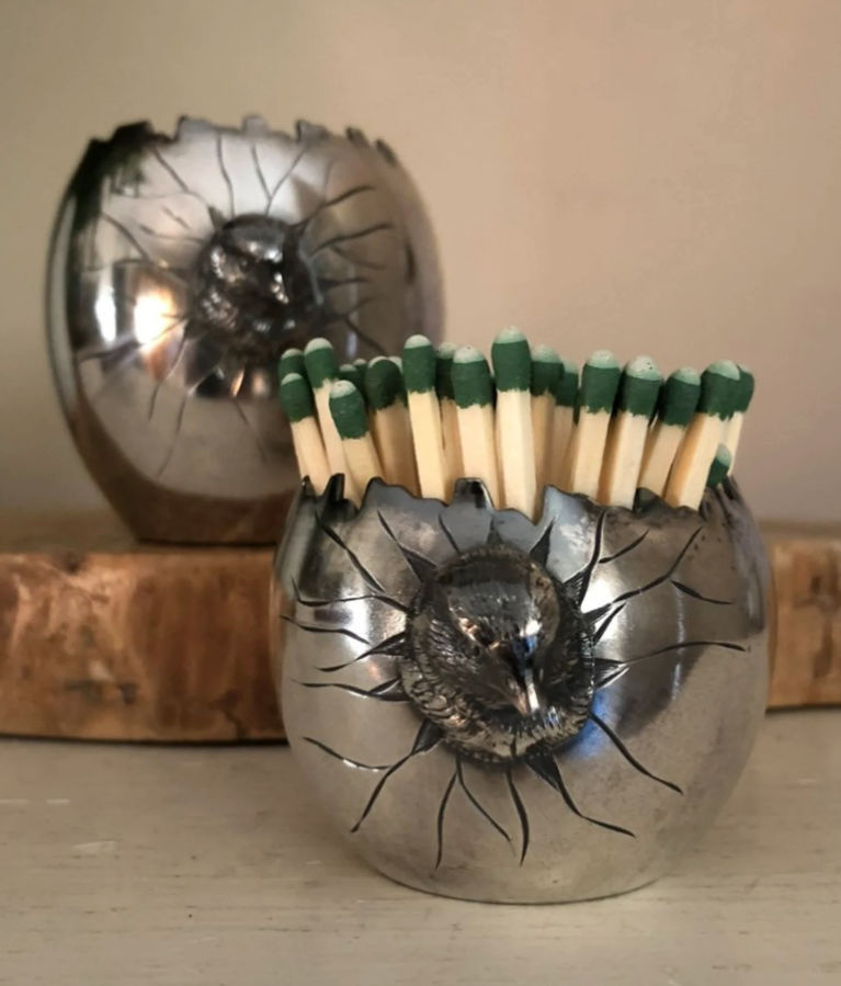And this little Victorian-era silver plate pair (cup and match striker) were finds from another Etsy store that I plan on keeping for myself..at least for awhile! Silver plate items from the 1800s tend to be well made, detailed and often delightfully quirky. I thought these chicks breaking out of their shells fit that perfectly.