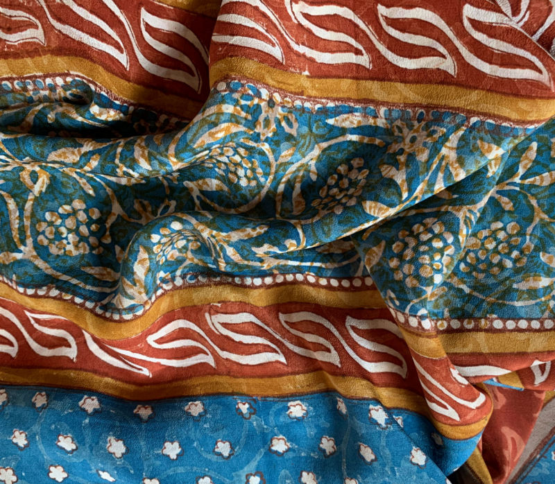 This lovely long hand-printed silk scarf (by Christina, India) is in my kind of colors, but I think I wore it once.