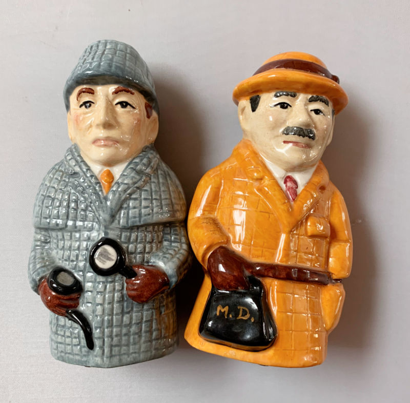 And wonder of wonder I actually found a few items at Goodwill today. Three were on the new merch cart and hadn’t hit the shelves yet! Like these ceramic Sherlock Holmes and Dr. Watson salt and pepper shakers. Not the usual thing I look for. Turns out they are somewhat scarce and were likely made for and sold at the Baker Street Museum in London. Recent ones have sold in the $40s. (Is it just me or does Dr. Watson’s medical bag like a purse Queen Elizabeth would carry?)