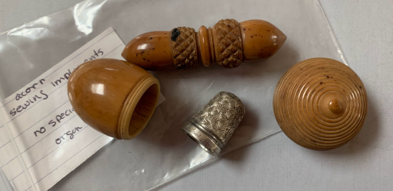 This is my best find today. A very old vegetable ivory acorn thimble and needle case set. Inside was a sterling silver thimble engraved and dated for January 1,1928. I’ll sell the thimble separate from the acorns. (Paid $5) I should be able to make $100 profit on these lovelies. Though they will be hard to part with.